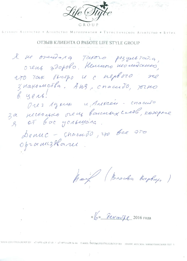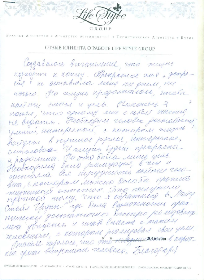 Life Style Group – современная компания свадебной индустрии, отличающаяся от существующих служб знакомств и брачных агентств, собственными эффективными методиками и технологиями, созданными на основе российского и международного опыта в области семейной психологии и коучинга, детальным анализом запросов каждого Клиента и современного рынка услуг, регулярным контролем качества и динамичностью, а также строгой приверженностью к высокими стандартам сервиса, которые позволяют нам быть впереди и превосходить ожидания Клиентов!